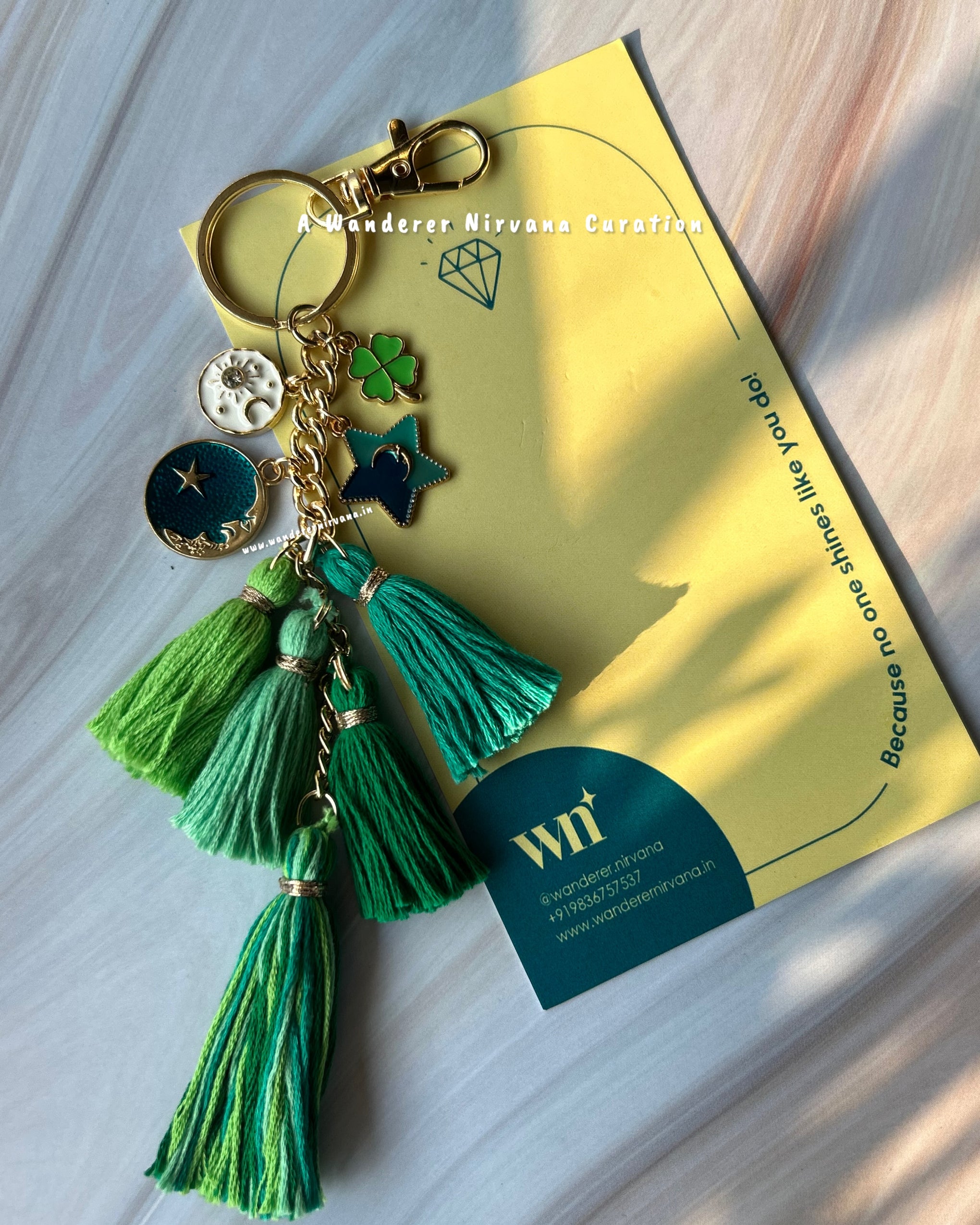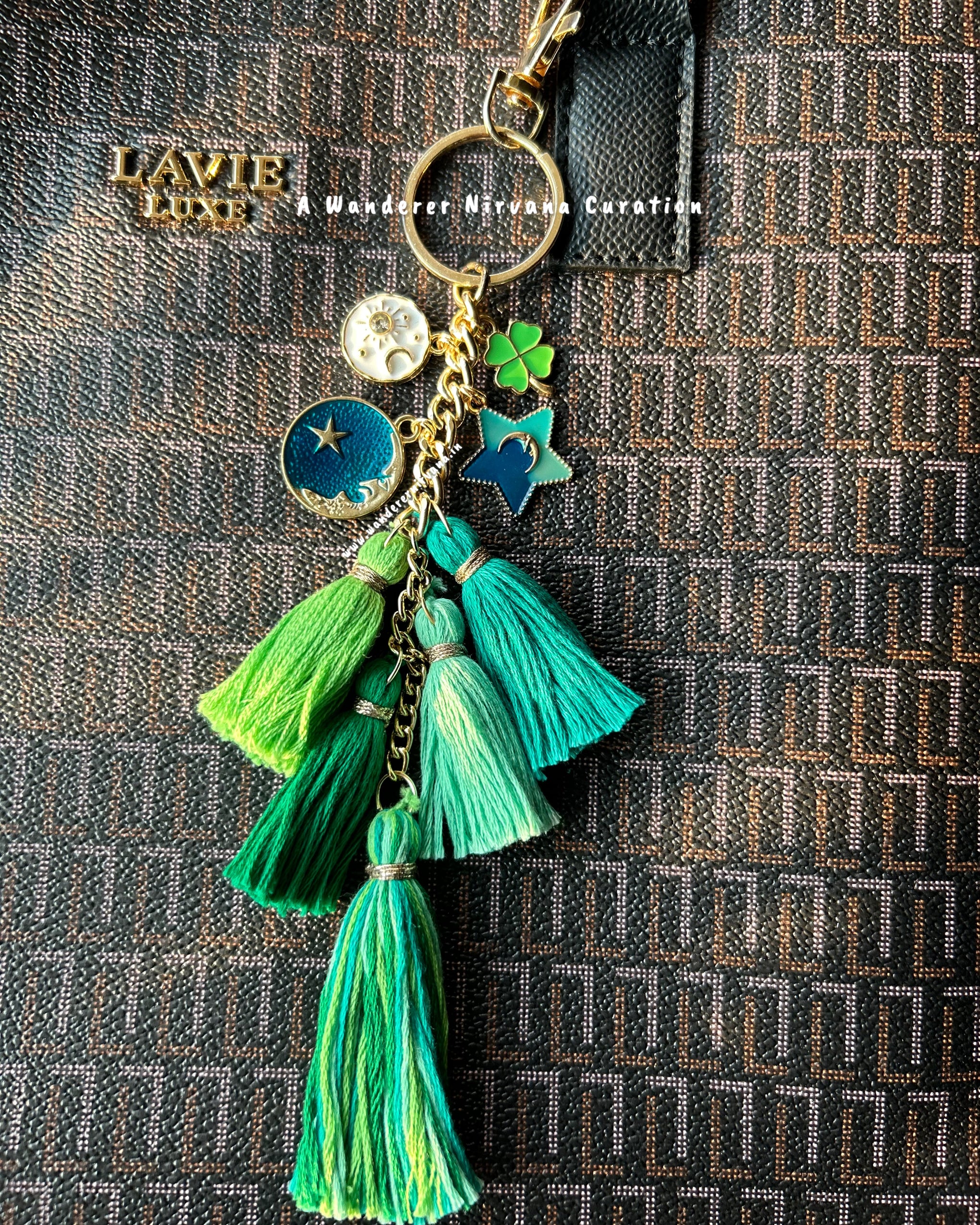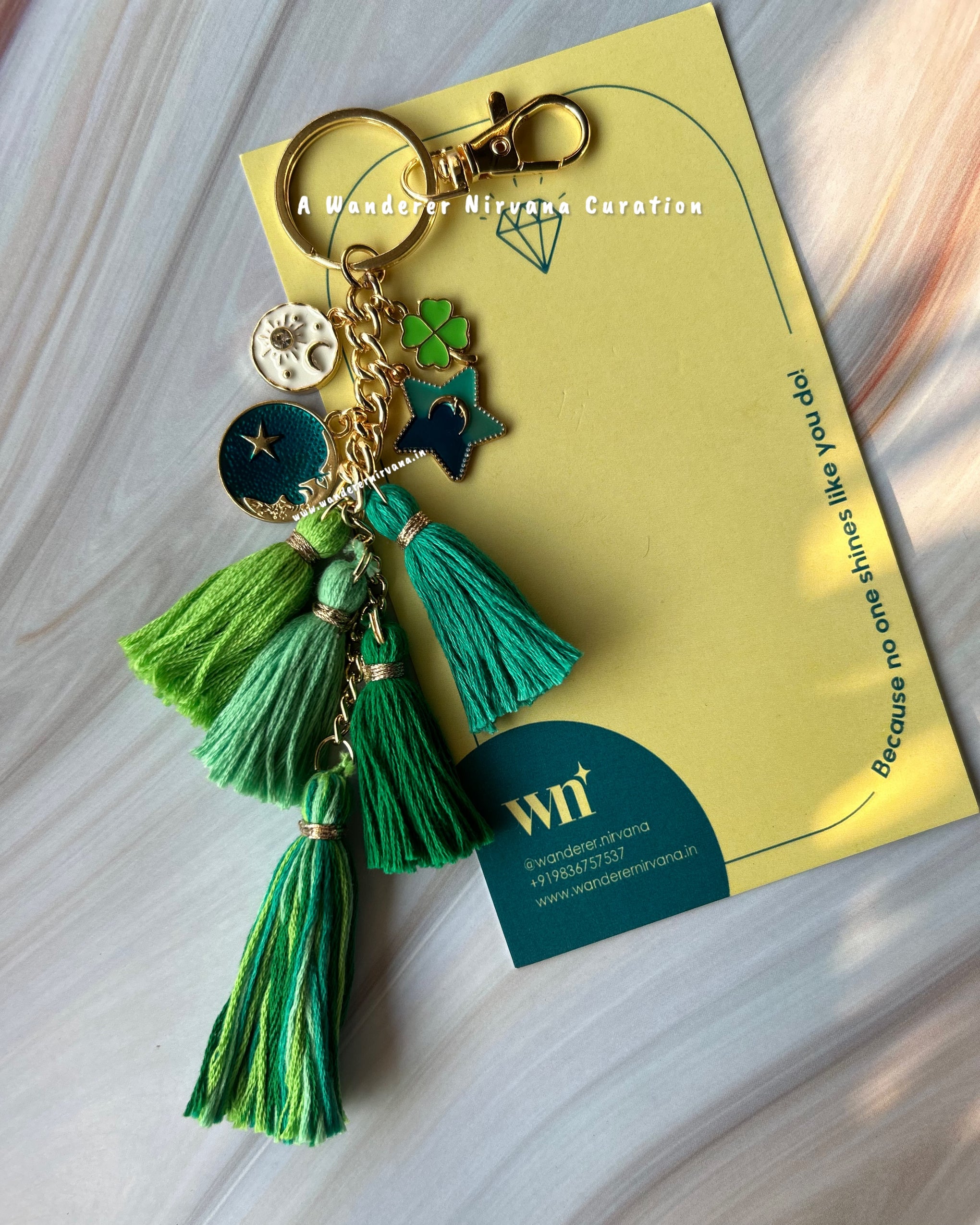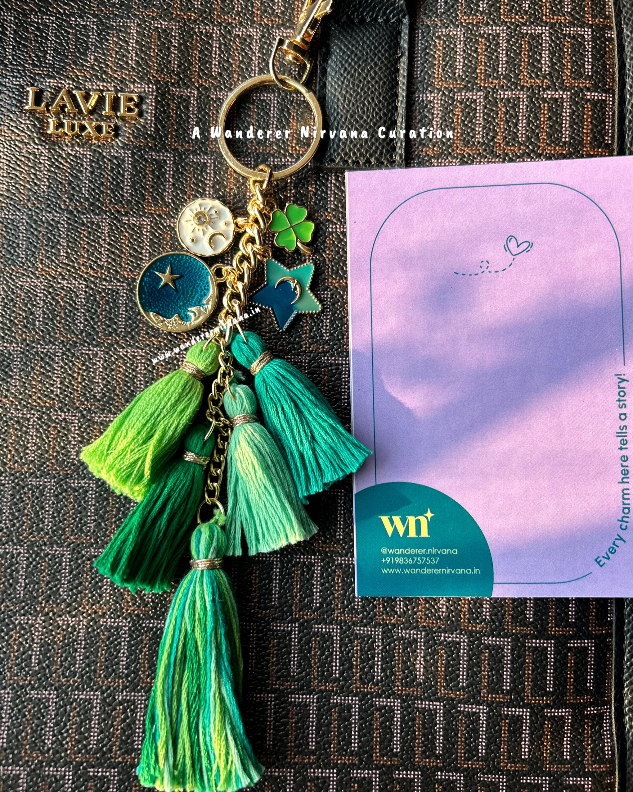 Featuring 4 mini tassels + 1 big tassel in a balanced green shade family, this handcrafted bagcharm combines style and intention. Lightweight and artisanal, it is designed to be carried with ease, doubling as a bag charm, car décor, or desk accessory.
