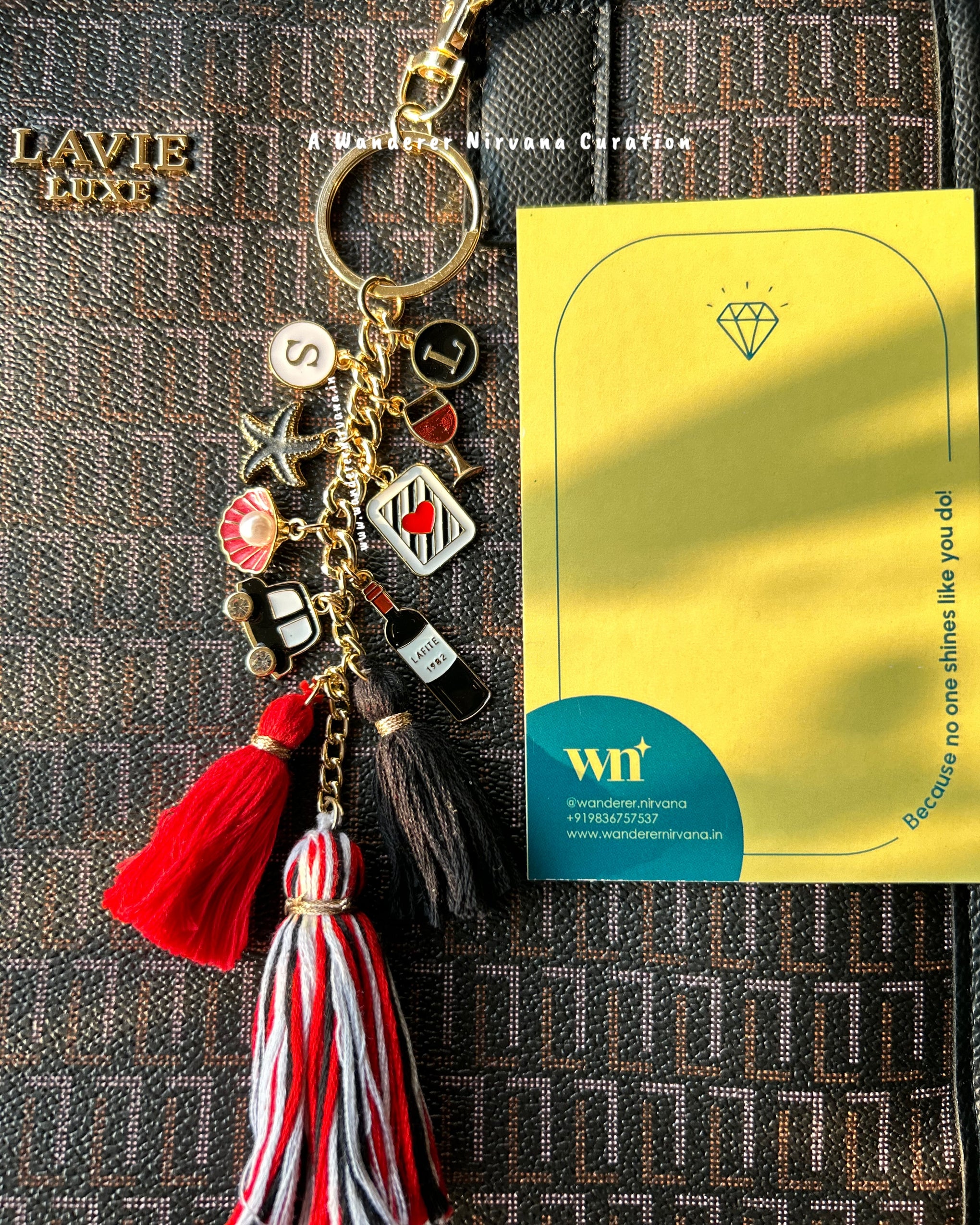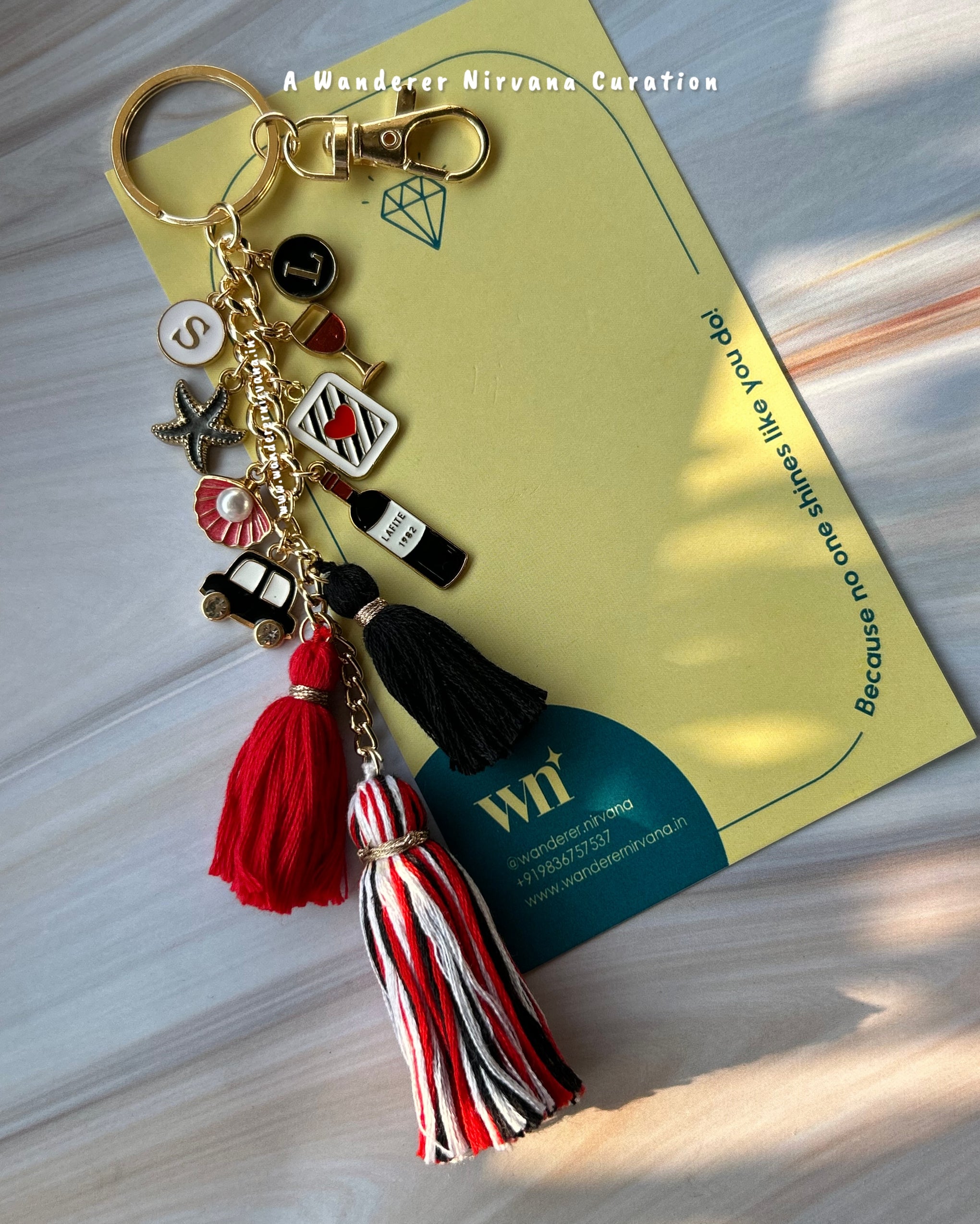 Featuring 1 mini tassel in red, 1 mini tassel in black, and 1 big tassel in a harmonious blend of red, black, and white shades, this handcrafted bagcharm balances style, story, and sentiment. Lightweight and artisanal, it doubles as a bag charm, car décor, or desk accessory, making it perfect for gifting or everyday use.