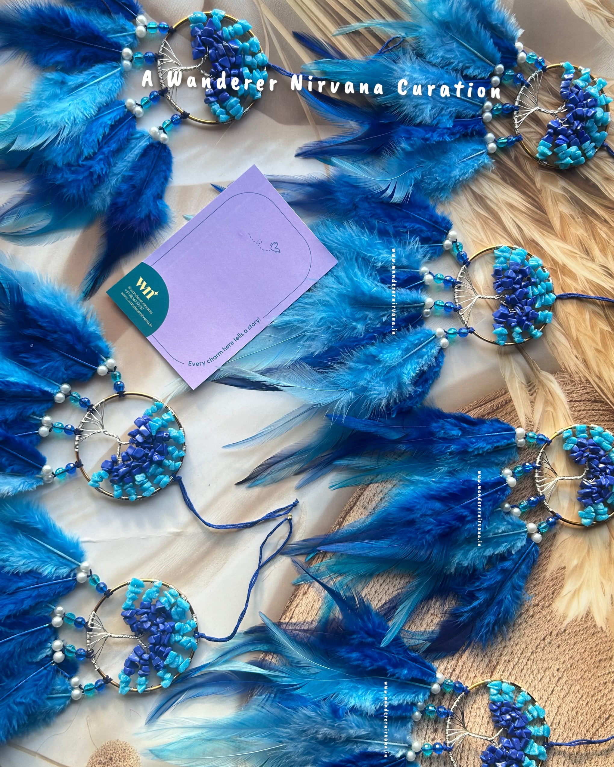 Wanderer Nirvana products are crafted using high-quality materials sourced from sustainable and ethical suppliers. Our dream catchers are made with artificial feathers, beads, and intricate weaving designs, while our keychains feature durable metals and vibrant accents.