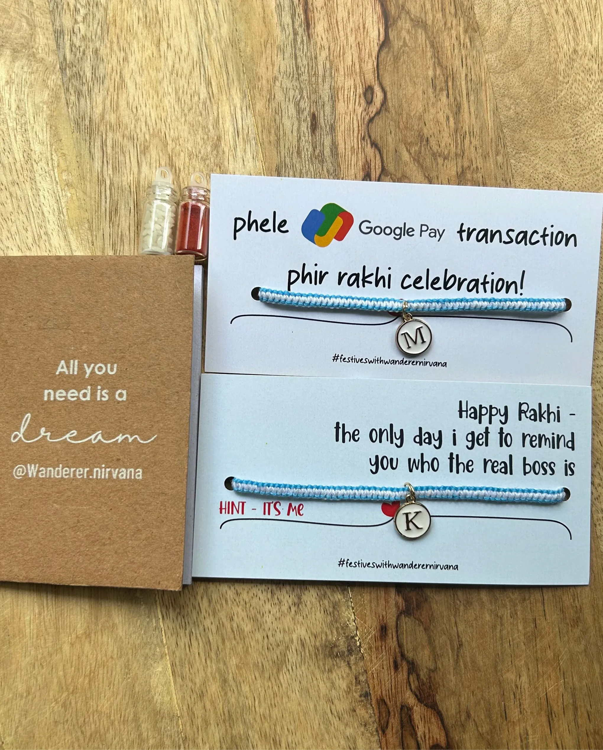 Intital Rakhi as the name suggests are Rakhis with intial, you can chose any alphabet you want, all the letters A -Z are available Steps to place the order : 1) Mention the alphabet. 2)Mention the thread colour. 3)Add to cart. 4) Voila you have just customised your own letter Rakhi with the colour of your choice Materials Used : thread, Enamel letter ,tools no. of piece per product -1