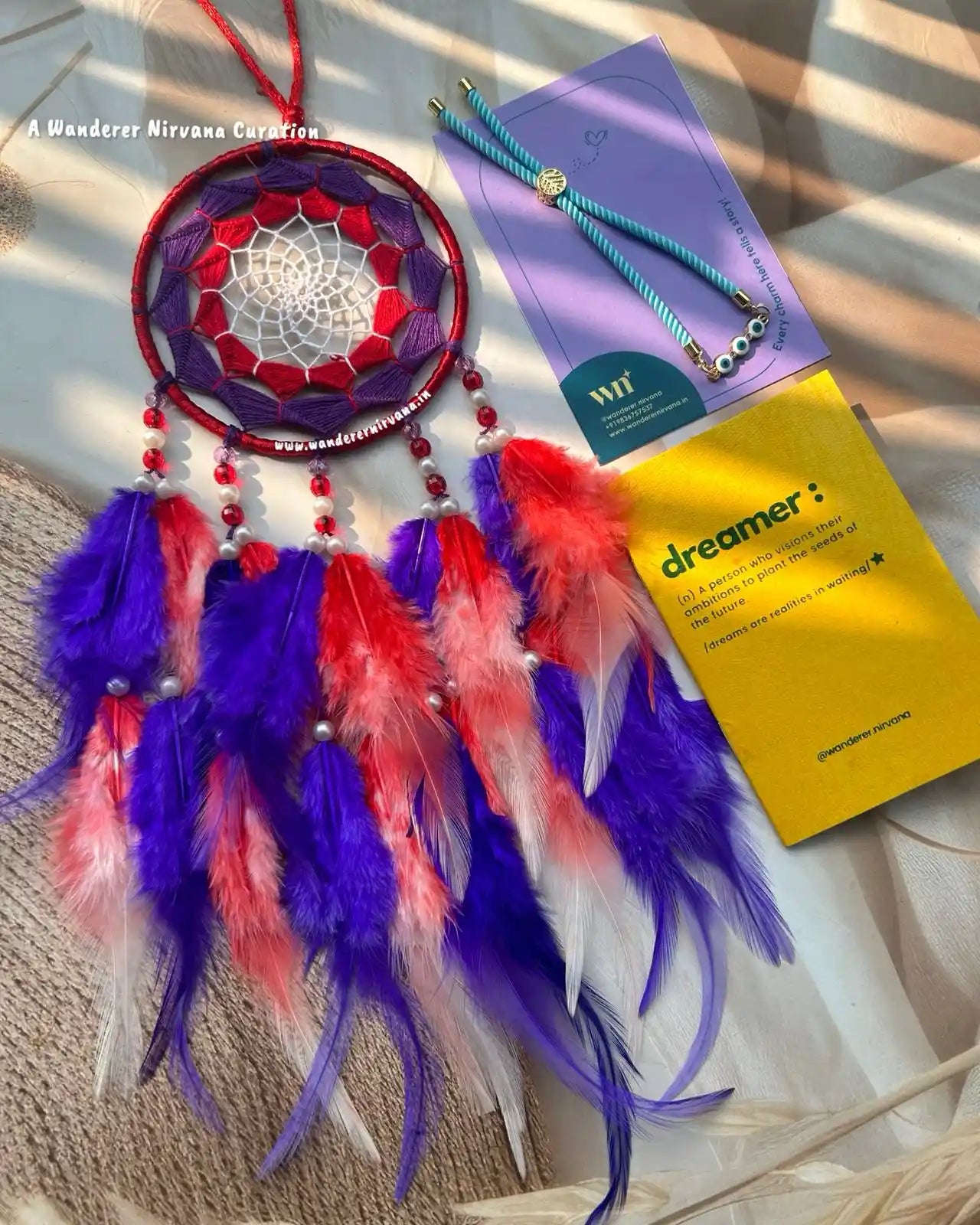 Wanderer Nirvana products are crafted using high-quality materials sourced from sustainable and ethical suppliers. Our dream catchers are made with artificial feathers, beads, and intricate weaving designs, while our keychains feature durable metals and vibrant accents.
