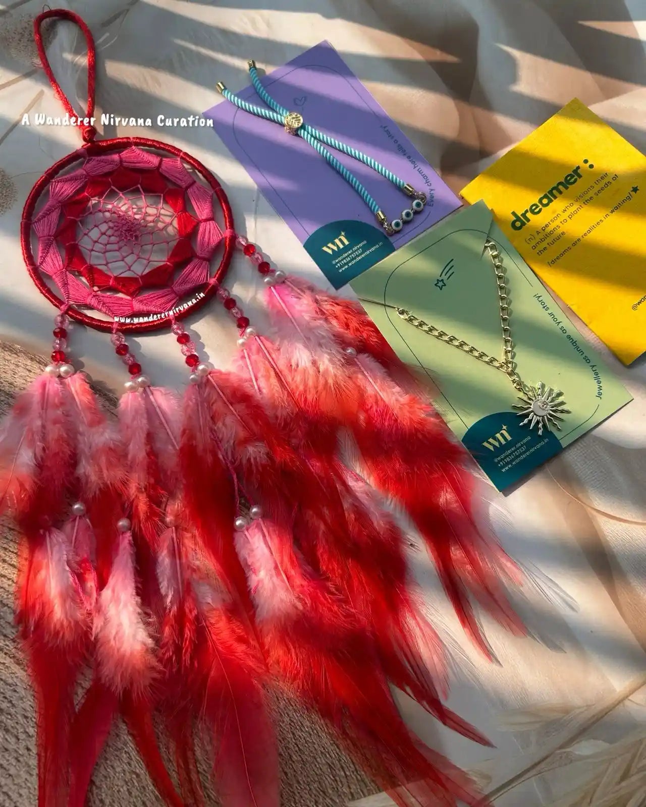 Wanderer Nirvana products are crafted using high-quality materials sourced from sustainable and ethical suppliers. Our dream catchers are made with artificial feathers, beads, and intricate weaving designs, while our keychains feature durable metals and vibrant accents.
