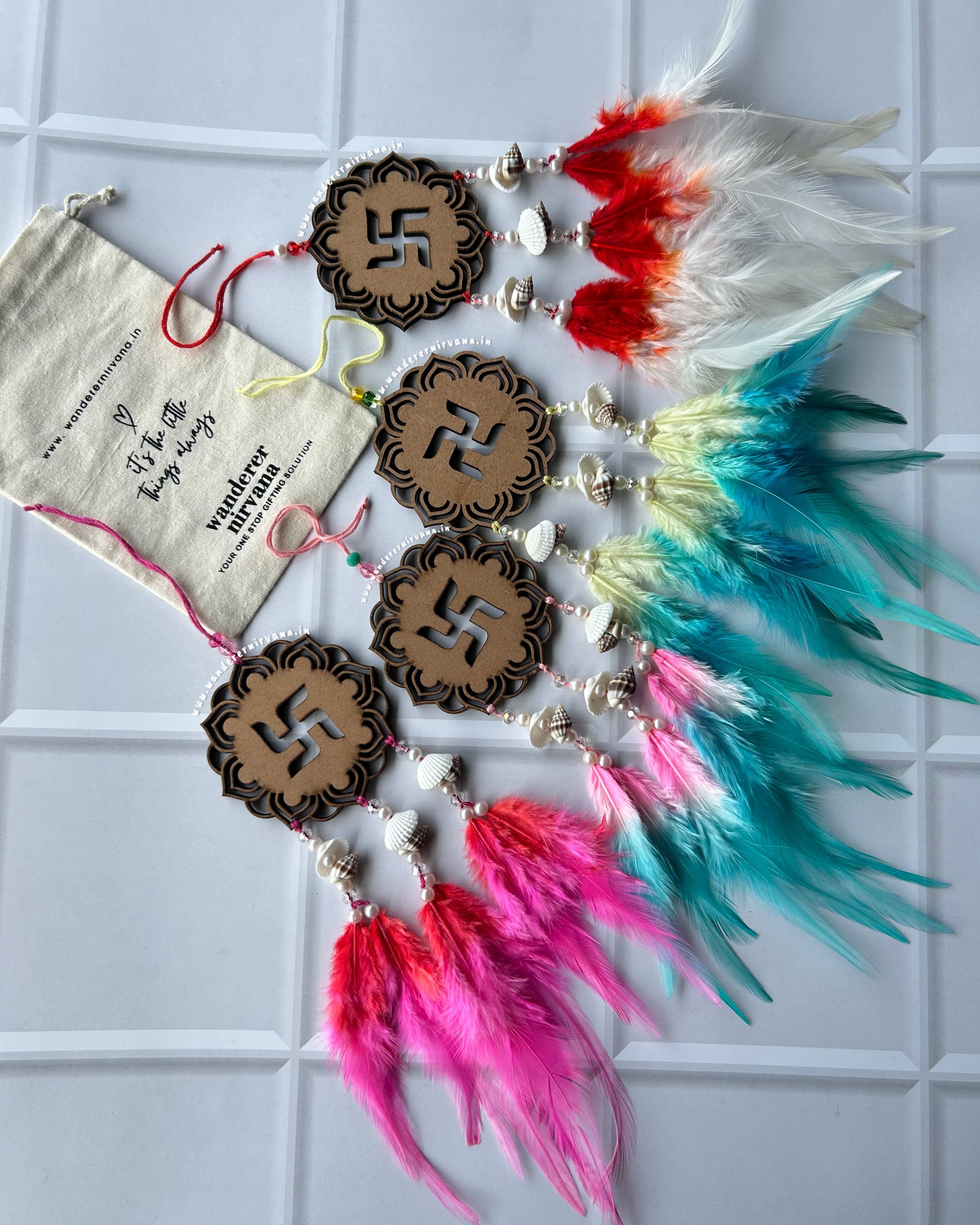 To prolong the life of your Wanderer Nirvana products, we recommend handling them with care and avoiding exposure to excessive moisture or direct sunlight. For dreamcatchers, gently dust them with a soft brush or cloth to remove any debris, and periodically fluff the feathers to maintain their shape. For keychains and accessories, store them in a cool, dry place when not in use to prevent tarnishing or damage.
