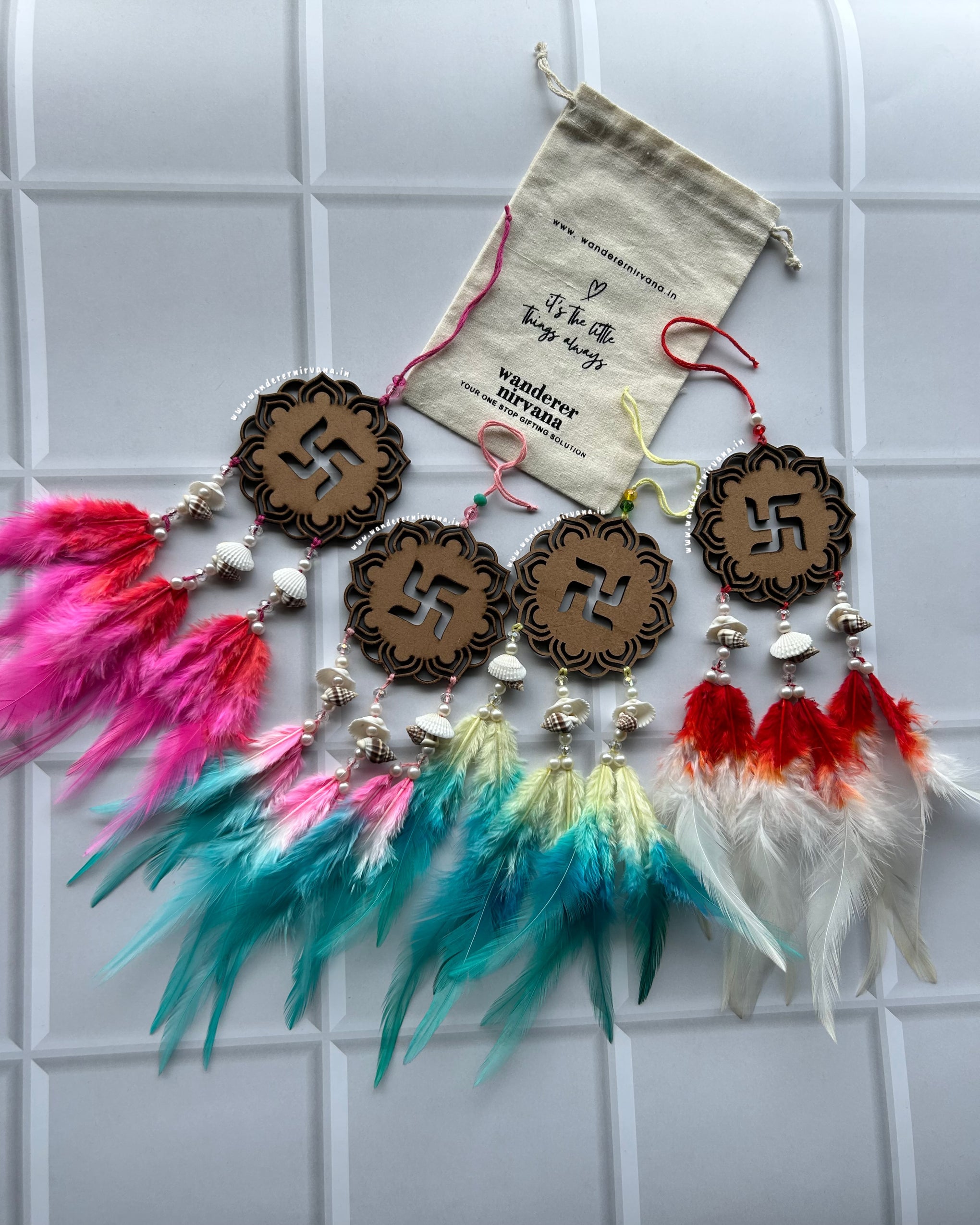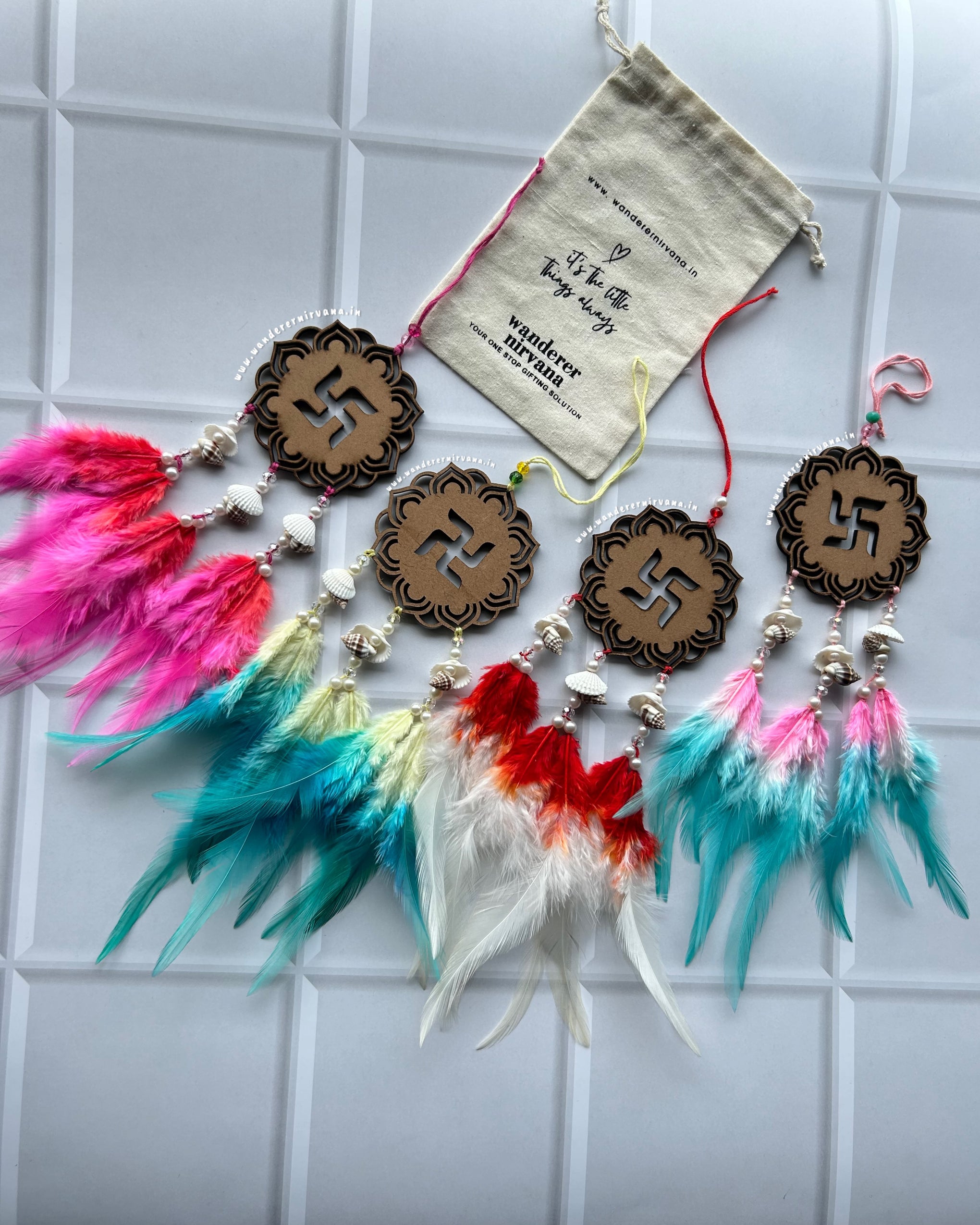 Wanderer Nirvana products are crafted using high-quality materials sourced from sustainable and ethical suppliers. Our dream catchers are made with artificial feathers, beads, and intricate weaving designs, while our keychains feature durable metals and vibrant accents.