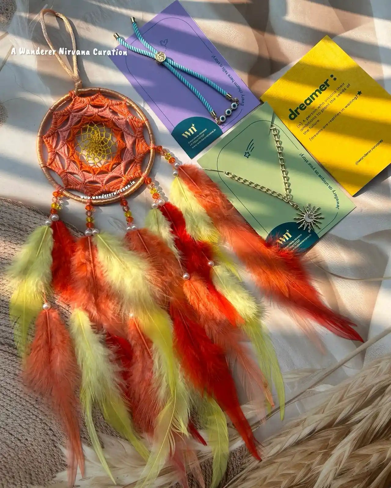 Wanderer Nirvana products are crafted using high-quality materials sourced from sustainable and ethical suppliers. Our dream catchers are made with artificial feathers, beads, and intricate weaving designs, while our keychains feature durable metals and vibrant accents.