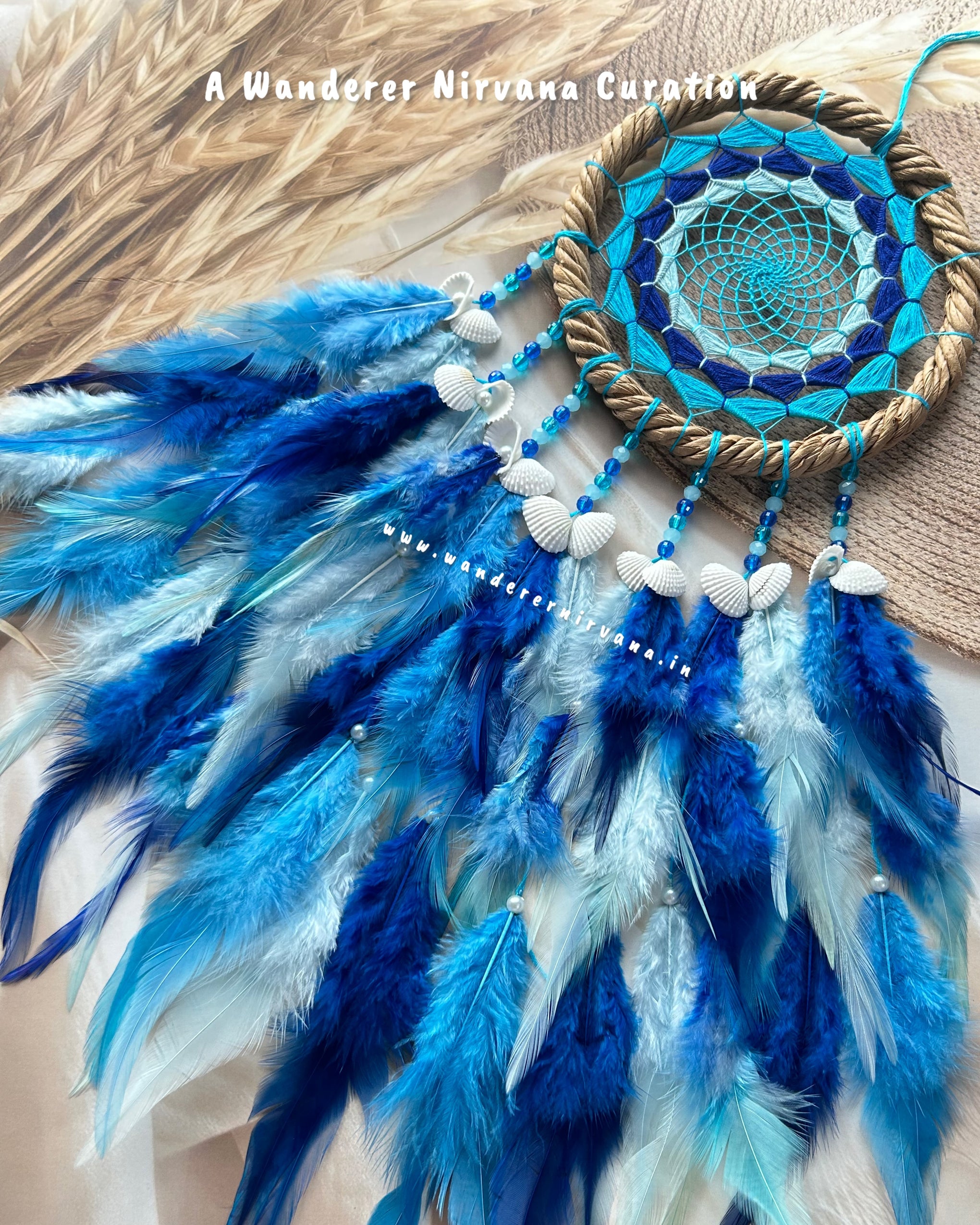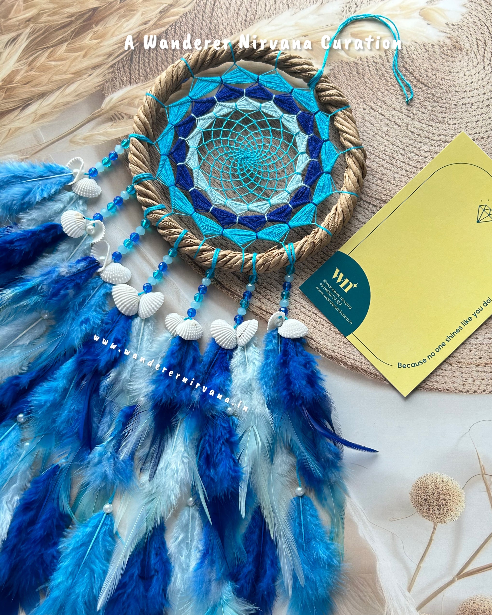 • Handmade coastal-inspired dreamcatcher with boho flair