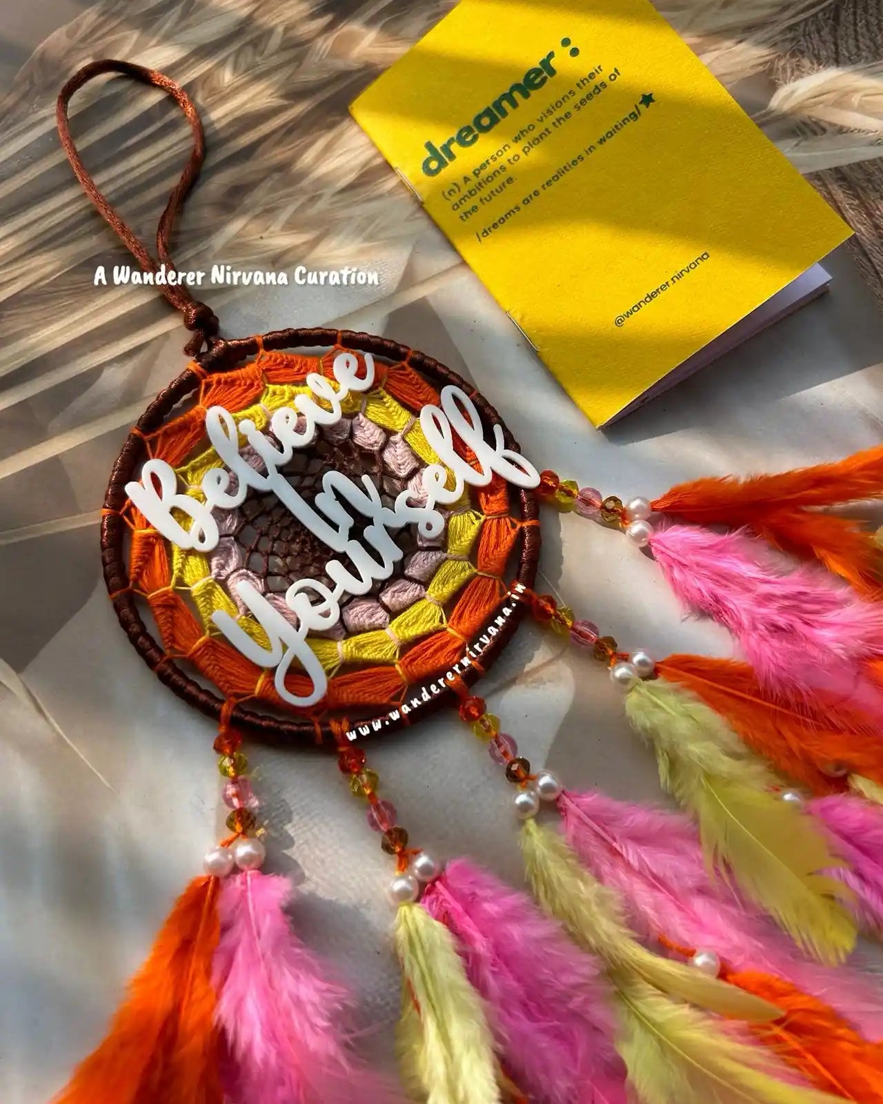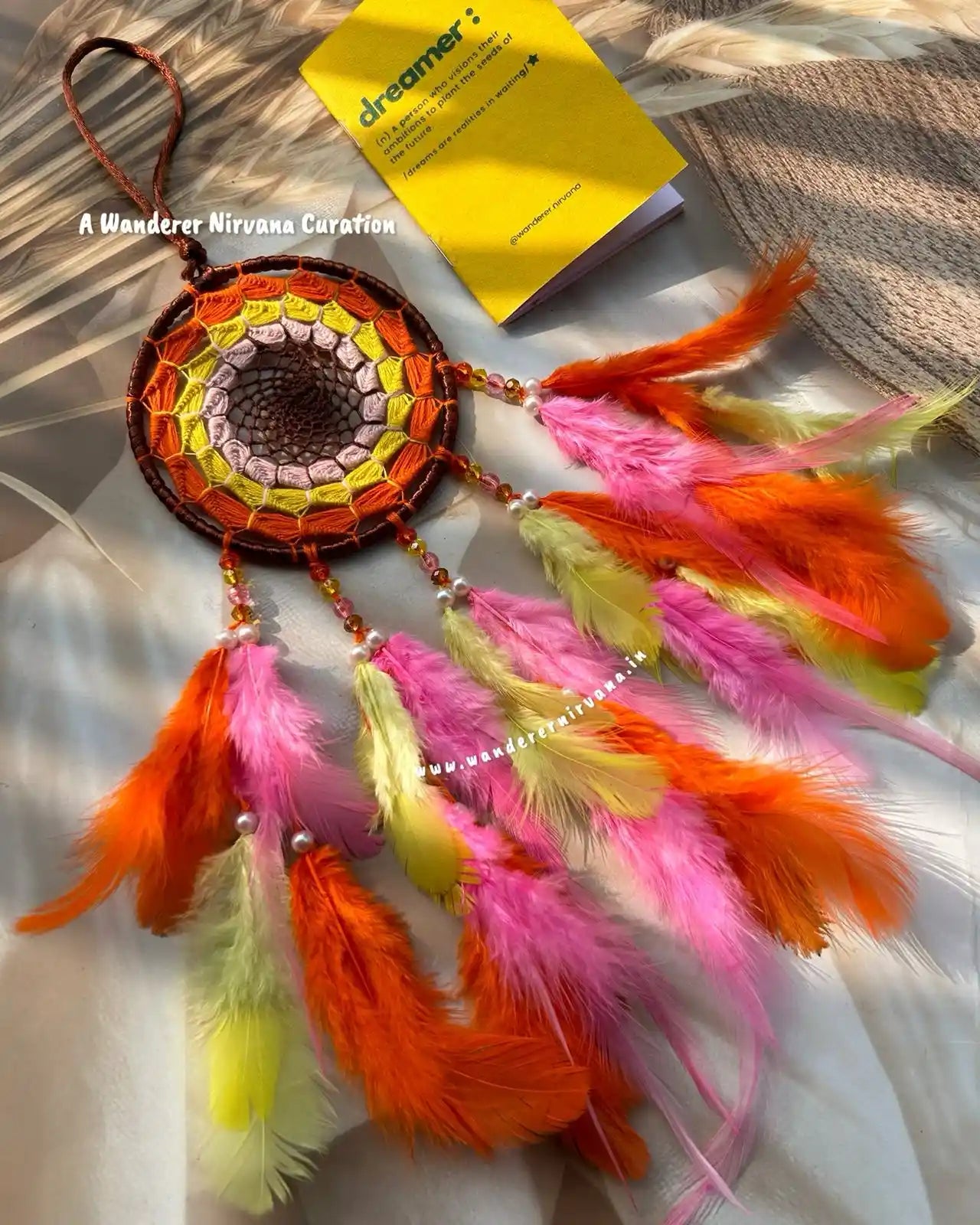 Wanderer Nirvana products are crafted using high-quality materials sourced from sustainable and ethical suppliers. Our dream catchers are made with artificial feathers, beads, and intricate weaving designs, while our keychains feature durable metals and vibrant accents.