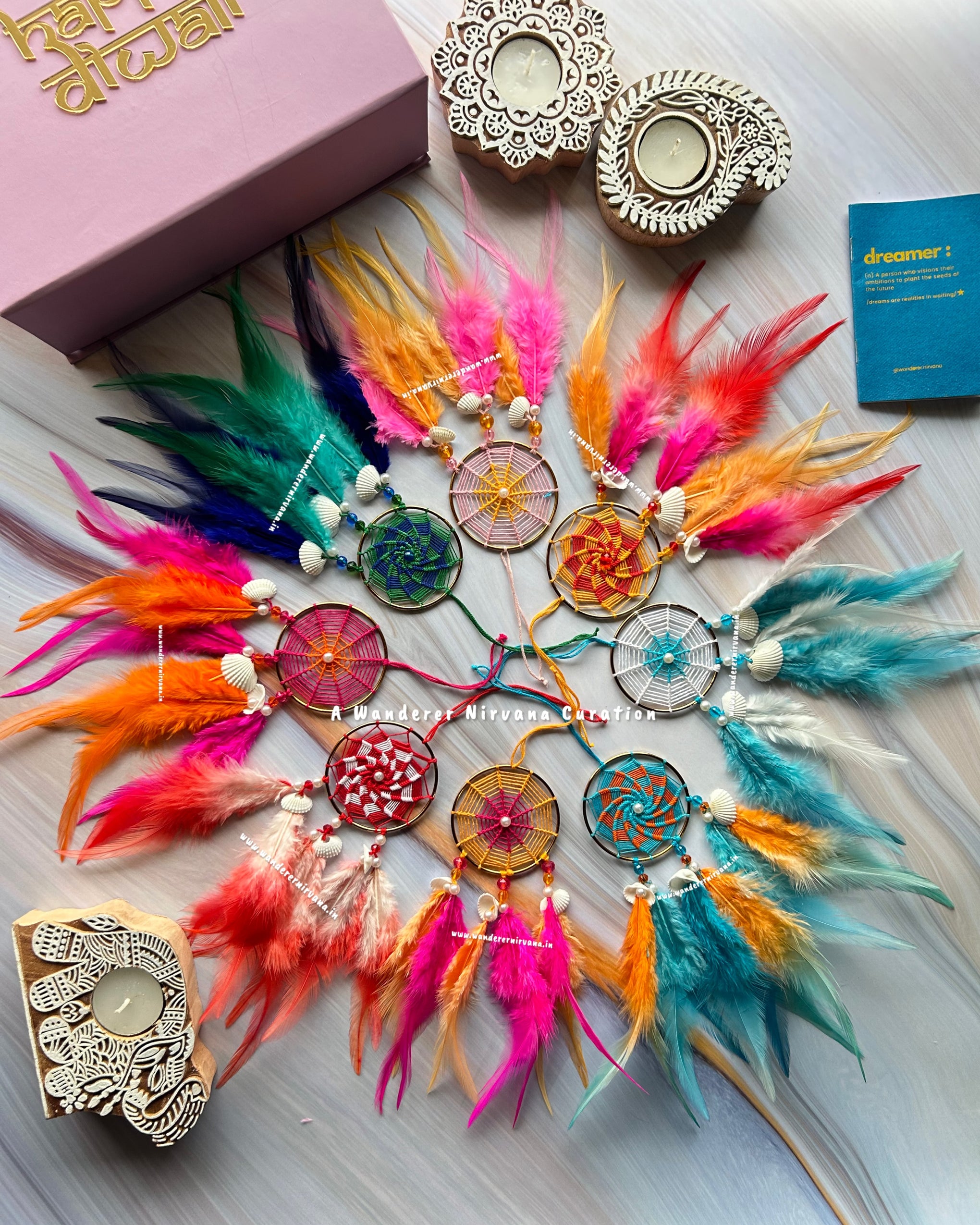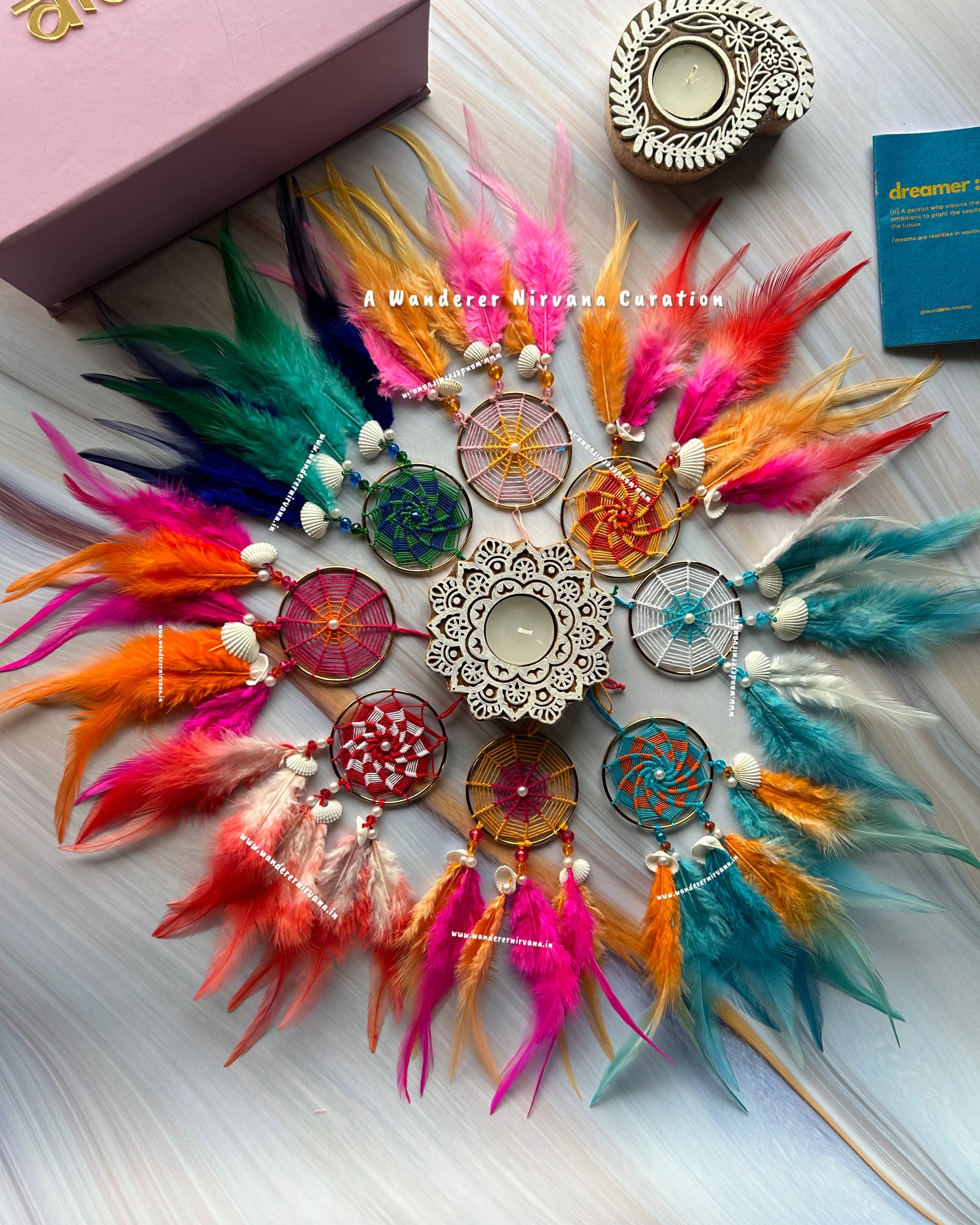 Wanderer Nirvana products are crafted using high-quality materials sourced from sustainable and ethical suppliers. Our dream catchers are made with artificial feathers, beads, and intricate weaving designs, while our keychains feature durable metals and vibrant accents.