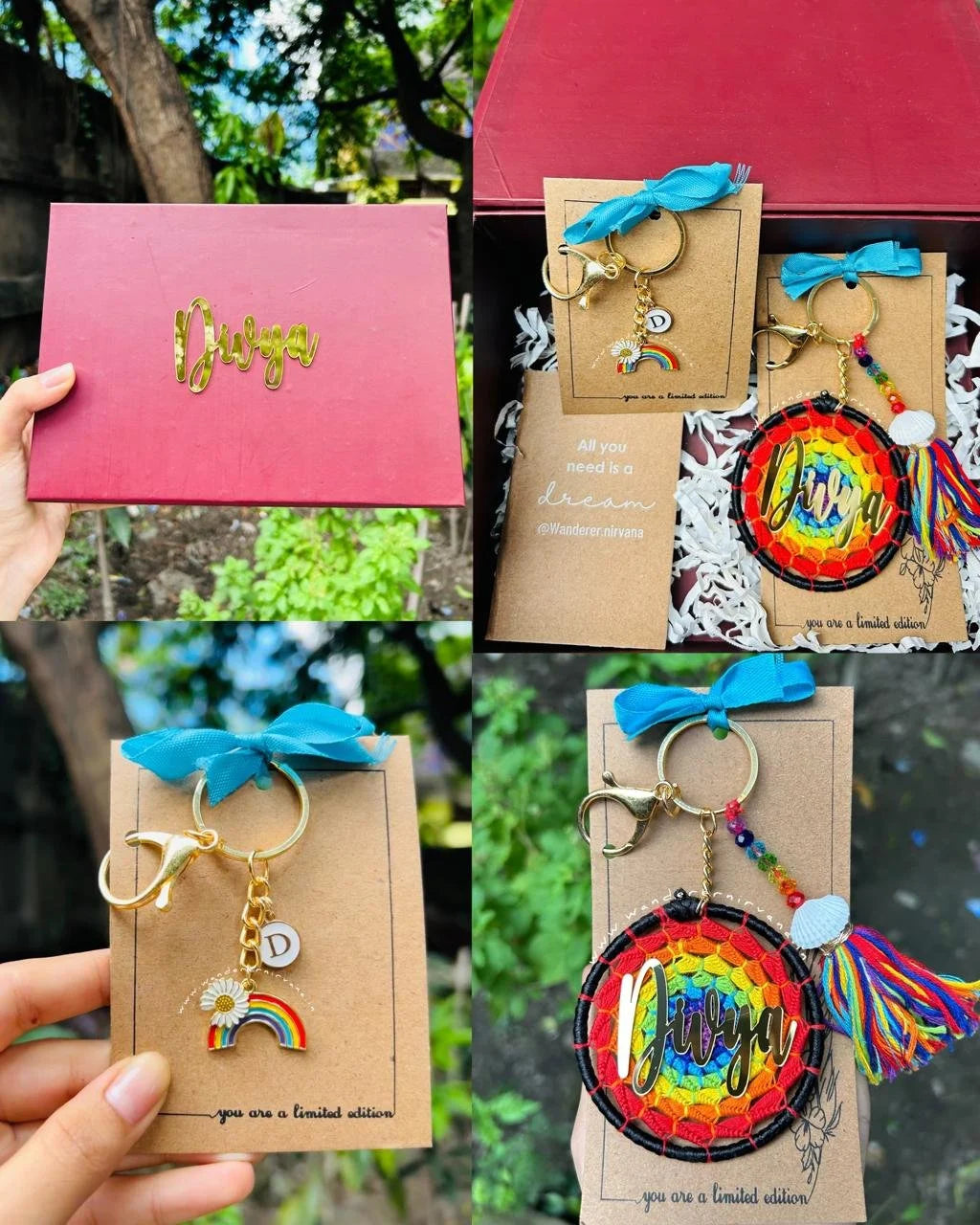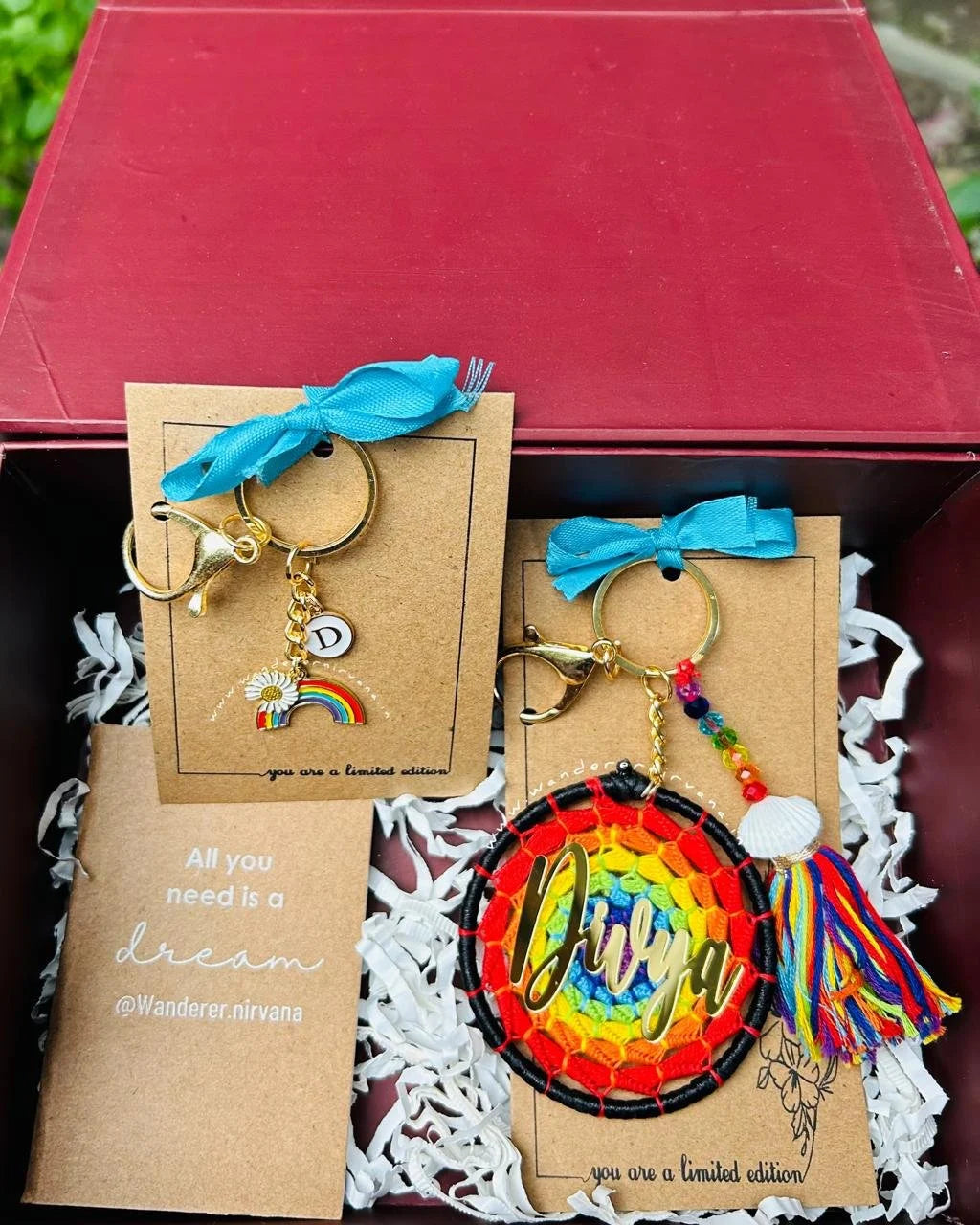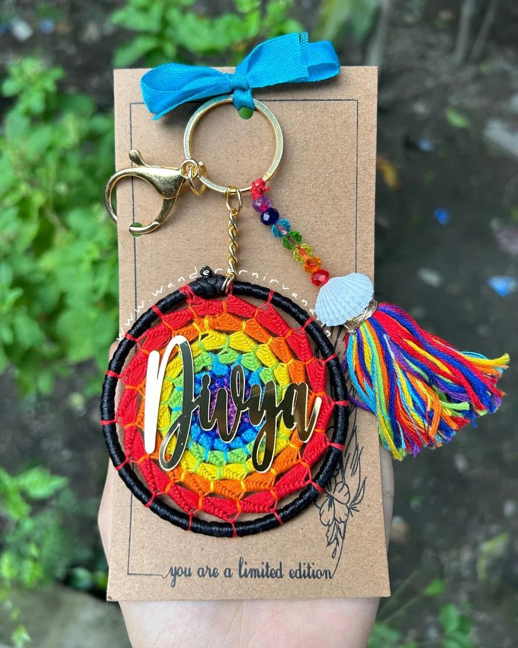 • Rainbow Weaved Dreamcatcher Keychain: This boutique piece, handmade in India, is carefully crafted to symbolise positivity and protection. You can personalise it with a name, making it both meaningful and unique.