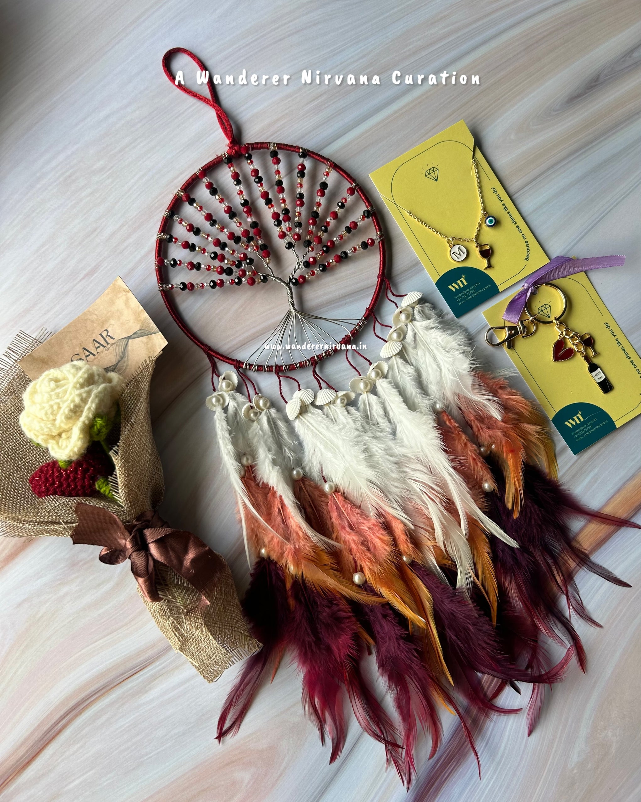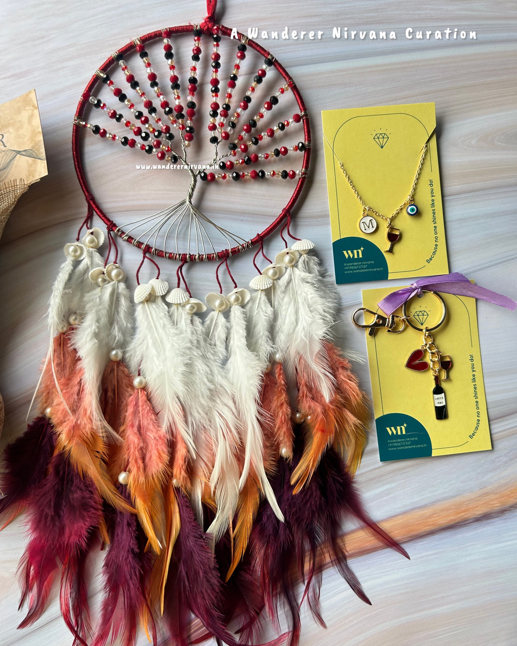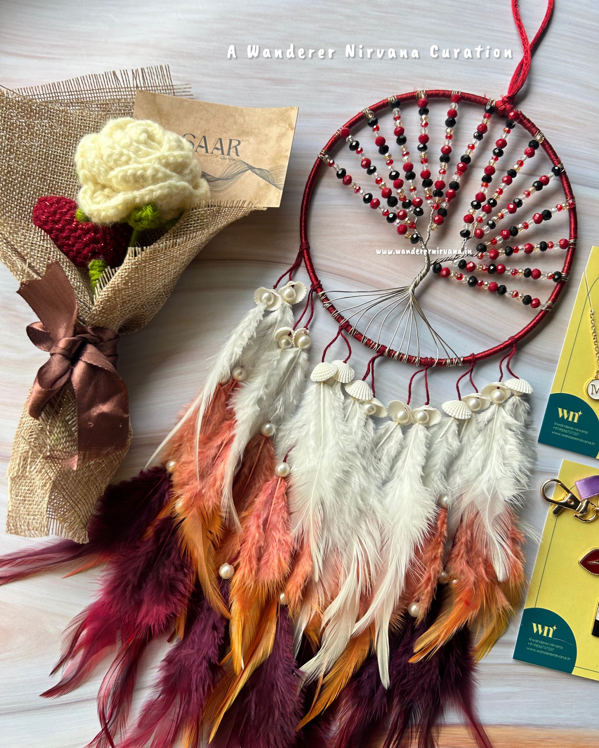 Wanderer Nirvana products are crafted using high-quality materials sourced from sustainable and ethical suppliers. Our dream catchers are made with artificial feathers, beads, and intricate weaving designs, while our keychains feature durable metals and vibrant accents.