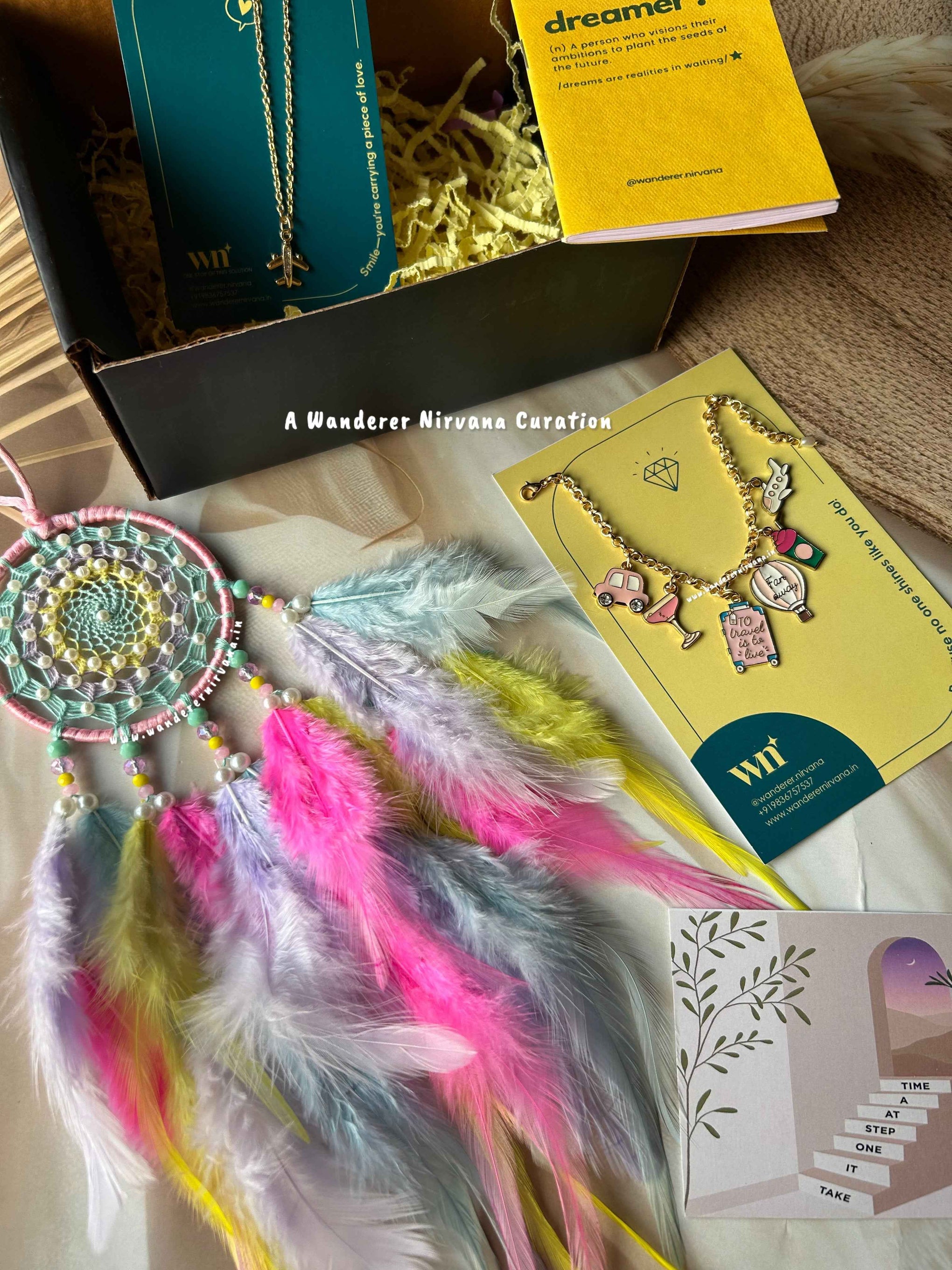 Wanderer Nirvana products are crafted using high-quality materials sourced from sustainable and ethical suppliers. Our dream catchers are made with artificial feathers, beads, and intricate weaving designs, while our keychains feature durable metals and vibrant accents.